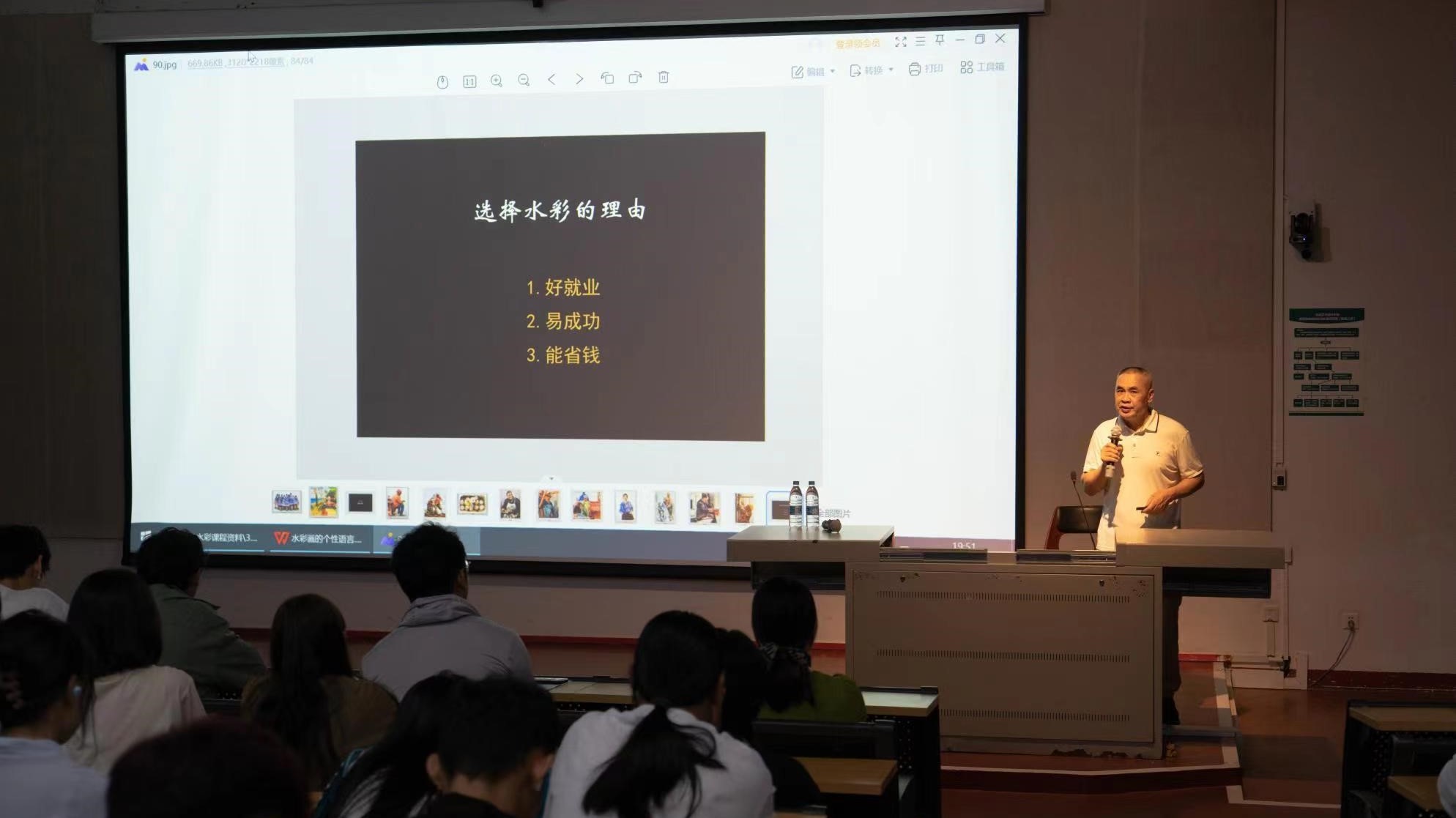 讲座伊始,刘广滨教授为同学们讲解了选择水彩的理由,主要从好就业、易成果、能省钱这三方面让同学们对学习水彩产生更多的兴趣。