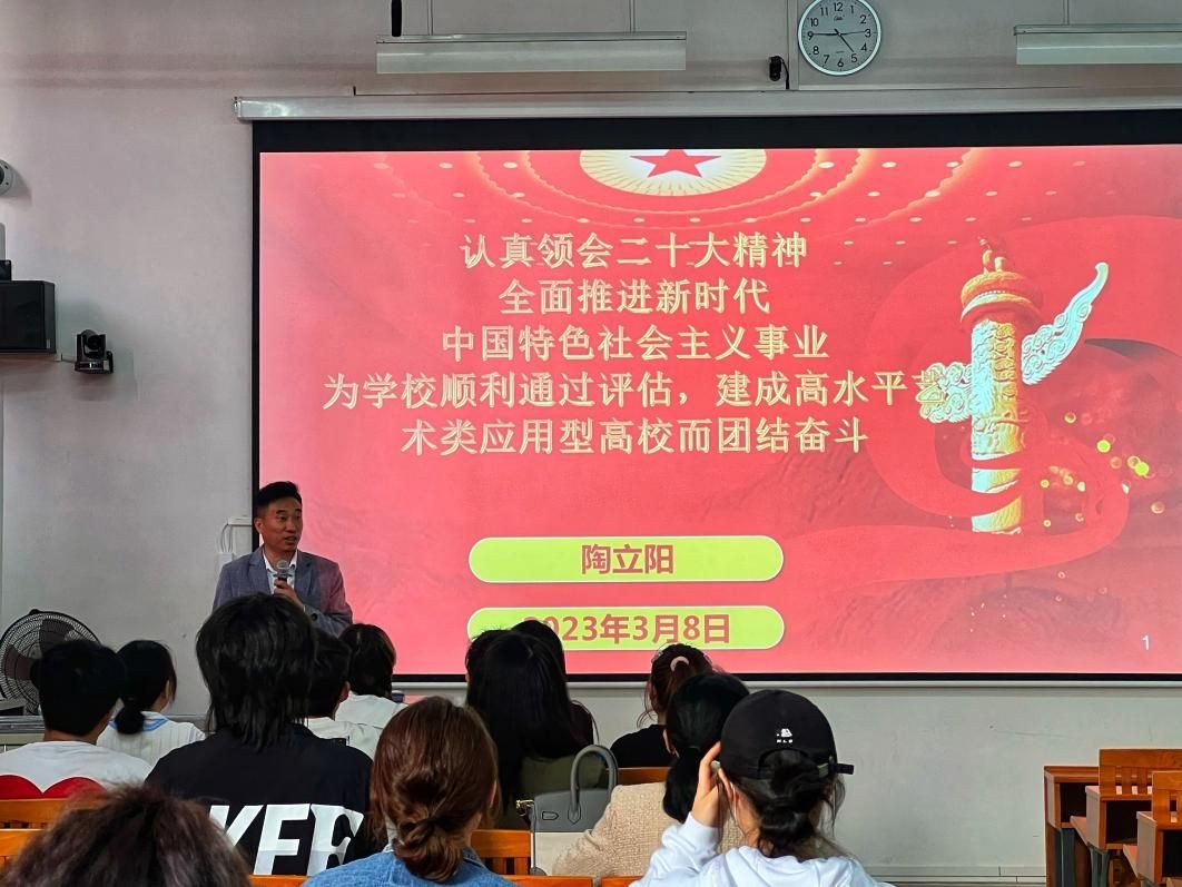 3月8日,陶立阳同志在功德楼115主持召开了“党的二十大精神”宣讲会,通识教育学院和动画与传媒学院师生代表参会。陶立阳同志结合党的二十大精神相关内容希望党员教师、积极分子认真学习领会党的二十大精神,以标准严格要求自己,在学习领悟中坚定理想信念,不忘初心、牢记使命,理论密切联系生活实际,积极发挥带头作用,要深刻领会大会主题的重大意义、思想要义、实践要求,深刻领悟大会报告和大会系列讲话、相关文件精神,明确方向、坚定信心,踔厉奋发、勇毅前行。