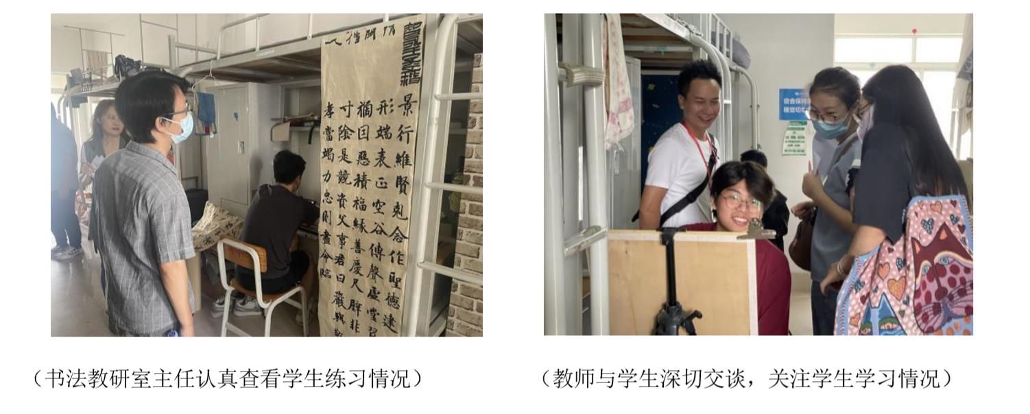 巡查小组首先对艺术楼的雕塑教室、地下摄影棚、绘画教室中正在上课教师和学生听课情况进行了全面检查。美术学院副院长龚为,副院长金凯婧、肖玺,以及各教研室主任在艺术楼与教师亲切交谈,查看教师上课前准备、学生到位情况,深入课堂现场听课,对任课教师的教学及学生上课情况等表示满意。同时,龚为、袁志伟(美术学院实训主任)还对教学环境进行了安全隐患排查,保障教学正常运行。随后检查小组走访部分2022级新生寝室,随机巡查学生网课学习情况,学生学习态度积极,认真听课并能够进行相应的课程练习。