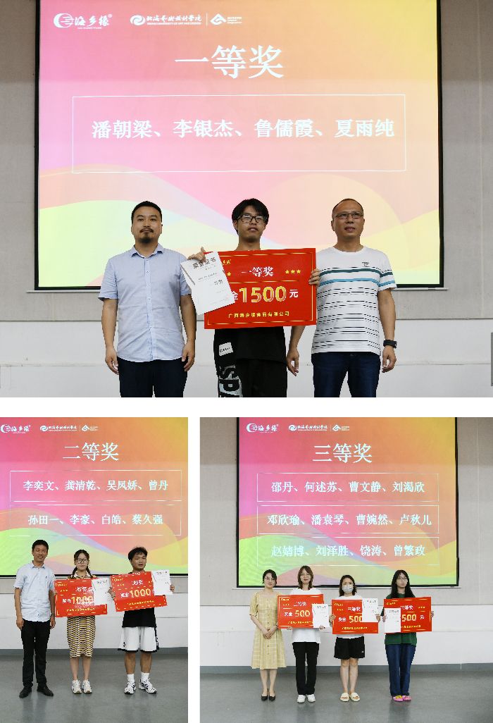 6月8日下午我院举办的“海乡缘杯”北海特产包装设计大赛、“海真珠杯”化妆品包装设计大赛、2022“海洋文化设计大赛”颁奖典礼在功德楼107顺利举行。广西海乡缘食品有限公司总经理黄祖伟、北海海真珠化妆品有限公司党支部书记兼营销总监林杰和总经理张锋忍、设计艺术学院院长李林平、副院长白建强、教研室主任张志、副主任陈莎、综合办主任吴慧霞出席本次颁奖典礼。