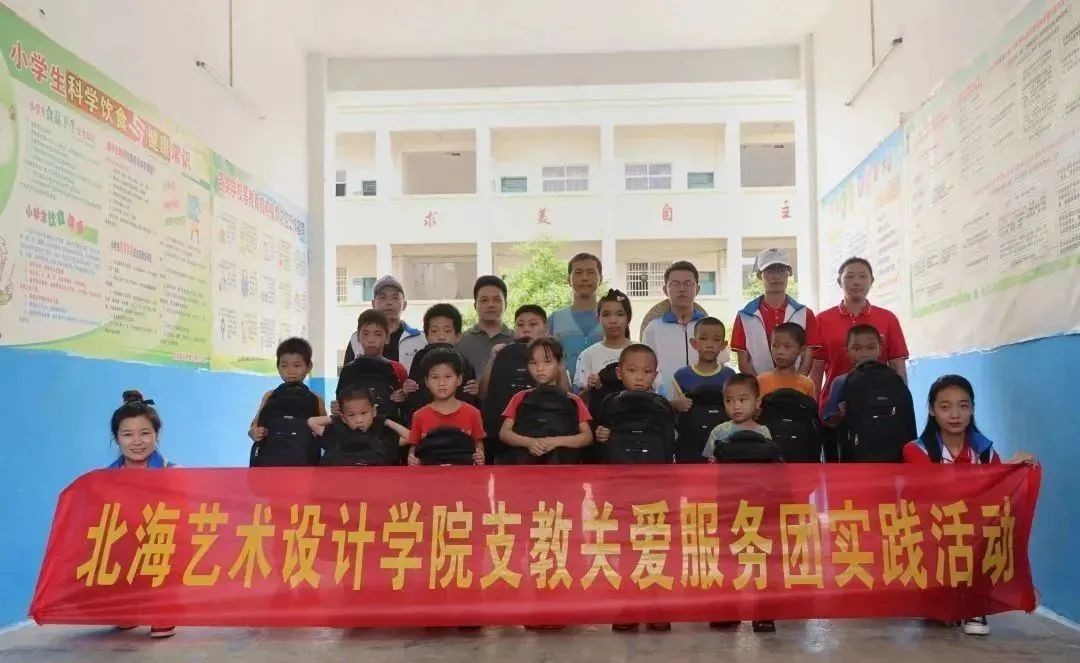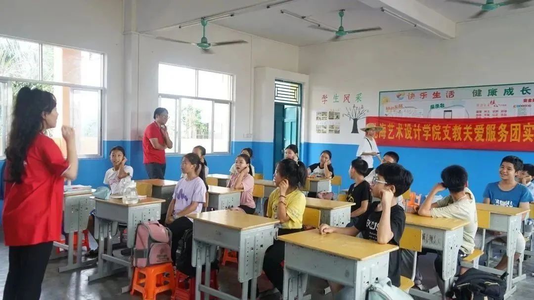6月15日下午,北海艺术设计学院支教关爱服务团在北海市合浦县石湾镇小学开展手工、音乐、绘画、口才小课堂,乡村小学校园文化墙绘设计等活动。将自己所学专业知识技能教授给红锦村小学的同学们,让同学们学有所得,把艺术课程带进红锦村小学。