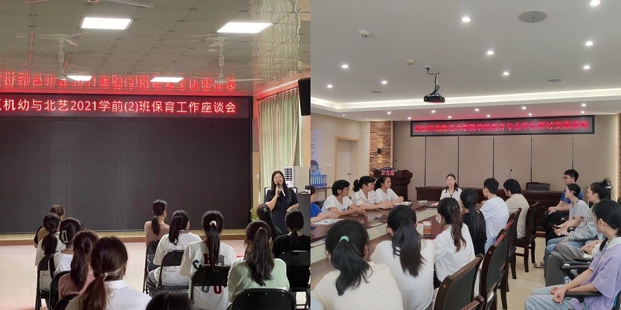 见习生参加保育座谈会                                                                 见习生与幼儿园老师研讨交流