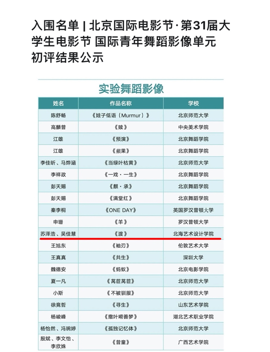 【北京国际电影节】是中国第二个获得国际电影制片人协会认可(FIAPF)的国际A类电影节。“国际青年舞蹈影像”单元主要面向全球范围内的青年创作者,征集多元化、跨类型的舞蹈影像作品,电影节鼓励全球范围内高校师生、新生代青年艺术家进行具有时代意义及创新性的创作,让舞蹈艺术与影像艺术突破边界、跨界融合产生新的生命力。本届国际青年舞蹈影像单元收到上百部作品,分别有10部舞蹈VLOG、20部实验舞蹈影像、4部舞蹈电影与纪实影像、17部舞蹈摄影入围最终评审,我校作品《渡》是其中一部。