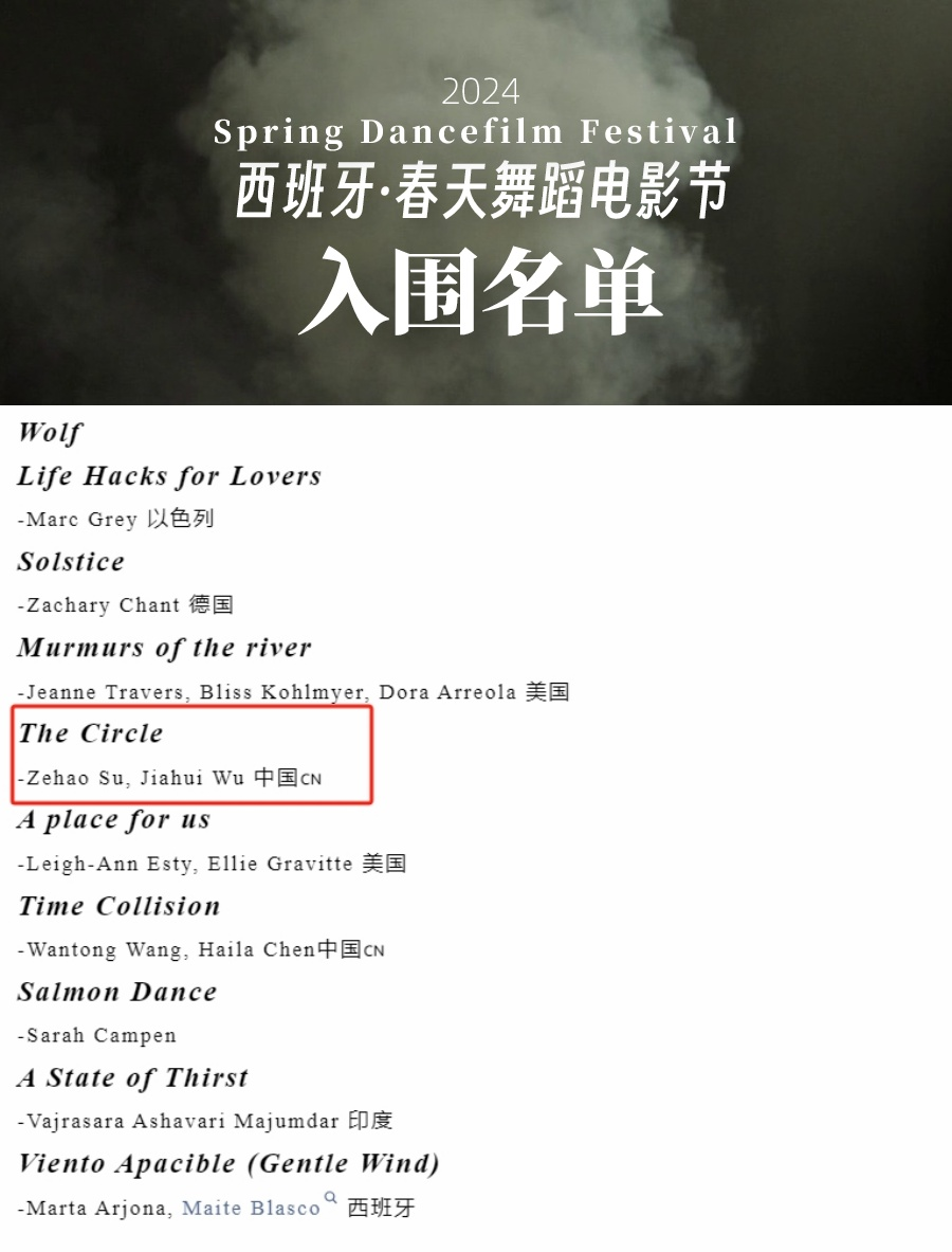 【西班牙·春天舞蹈影像节】是世界性、专业性极强的竞赛与展示平台,已连续举办9年。本届比赛有西班牙、英国、美国等世界各地的艺术家投稿,入围名单是在全球不同组别递交申请的250多个作品中,共选择出了20多项入围展演的作品,中国入围3件作品。目前作品仍在评奖阶段。