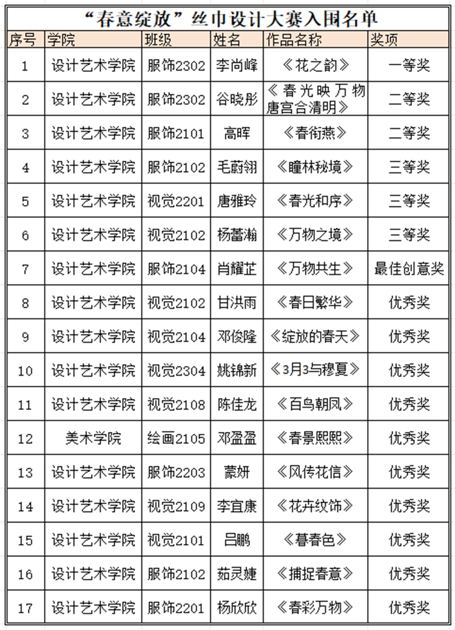 为提升专业人才培养质量,丰富学生校园专业实践活动,设计艺术学院举办了第一届“春意绽放”丝巾设计大赛并于6月7日在南校区举行颁奖仪式。