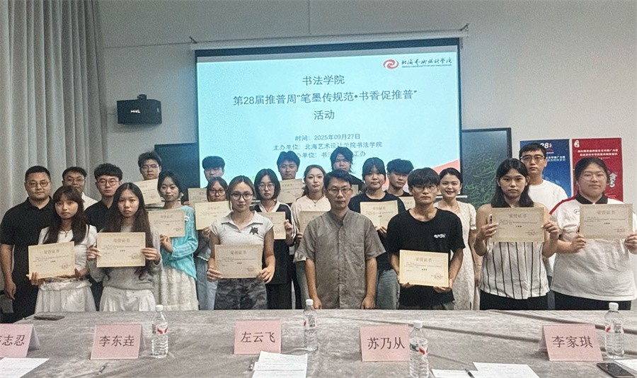 为加大国家通用语言文字推广力度,促进铸牢中华民族共同体意识,书法学院于9月19日至26日组织开展了推普活动,并于9月27日举办“笔墨传规范·书香促推普”宿舍规范汉字书写比赛暨推普成果展示活动。学院常务副院长苏乃从、党支部副书记左云飞,副院长李东垚、李家琪、黄荣婷、韦志忍出席活动并担任评审。