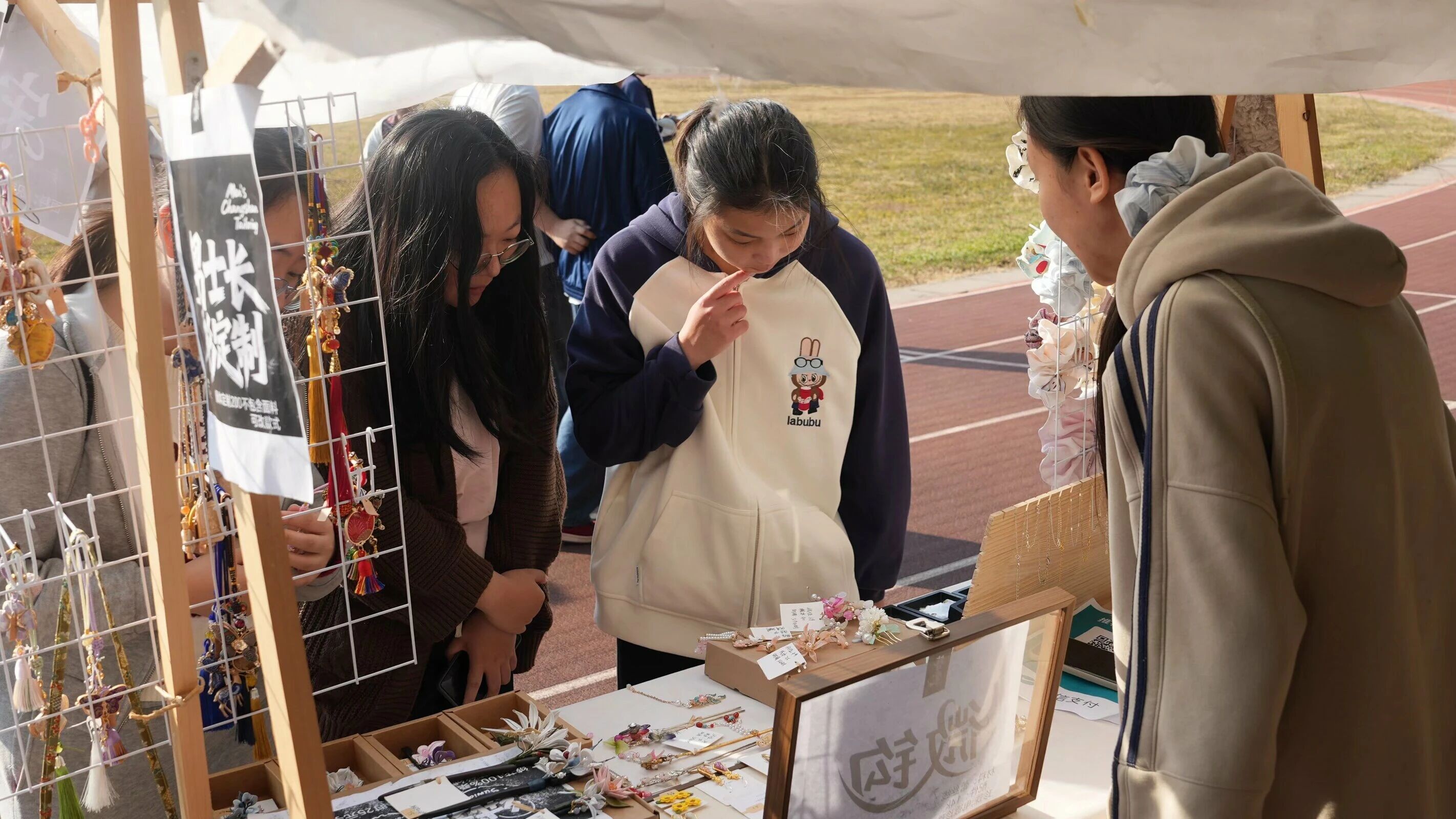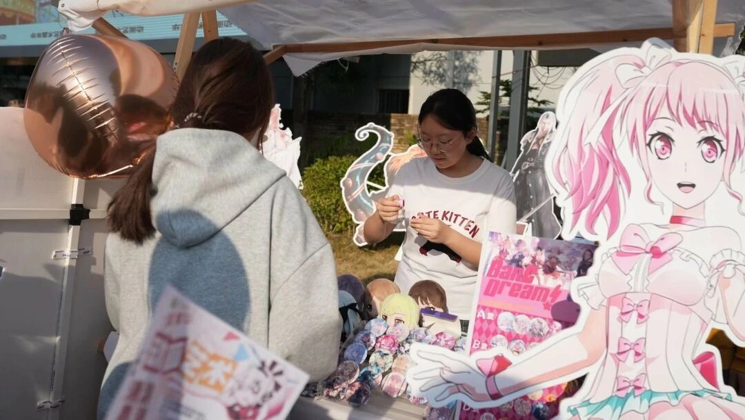 活动现场洋溢着热烈欢快的氛围,动画创意集市各摊位前人头攒动、热闹非凡。学生原创产品琳琅满目,设计新颖且充满巧思,既有贴合青春主题的潮流设计,也有融入传统元素的创意表达,引得同学们纷纷驻足。
